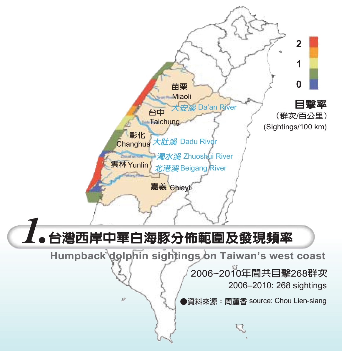 After four years of surveying, Chou has found that Taiwan's humpback dolphins range from the Miaoli County fishing port of Longfeng in the north to Tainan County's Jiangjun fishing port in the south, and spend their time in water averaging 7.6 meters deep and three kilometers from shore. Their range is thus a narrow band extending some 200 kilometers from north to south, including two main "hotspots" for hunting and social activity. One hotspot extends from southern Miaoli to northern Changhua, while the other runs from Yunlin to the Waisanding barrier island at the border of Yunlin and Chiayi counties (Fig 1).