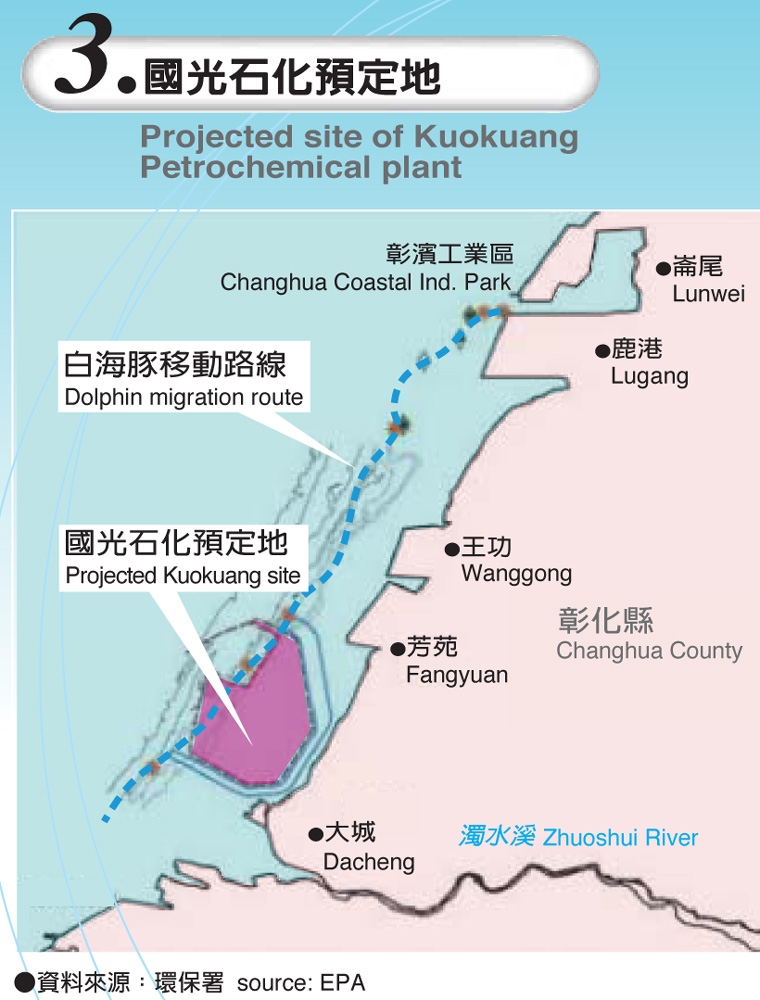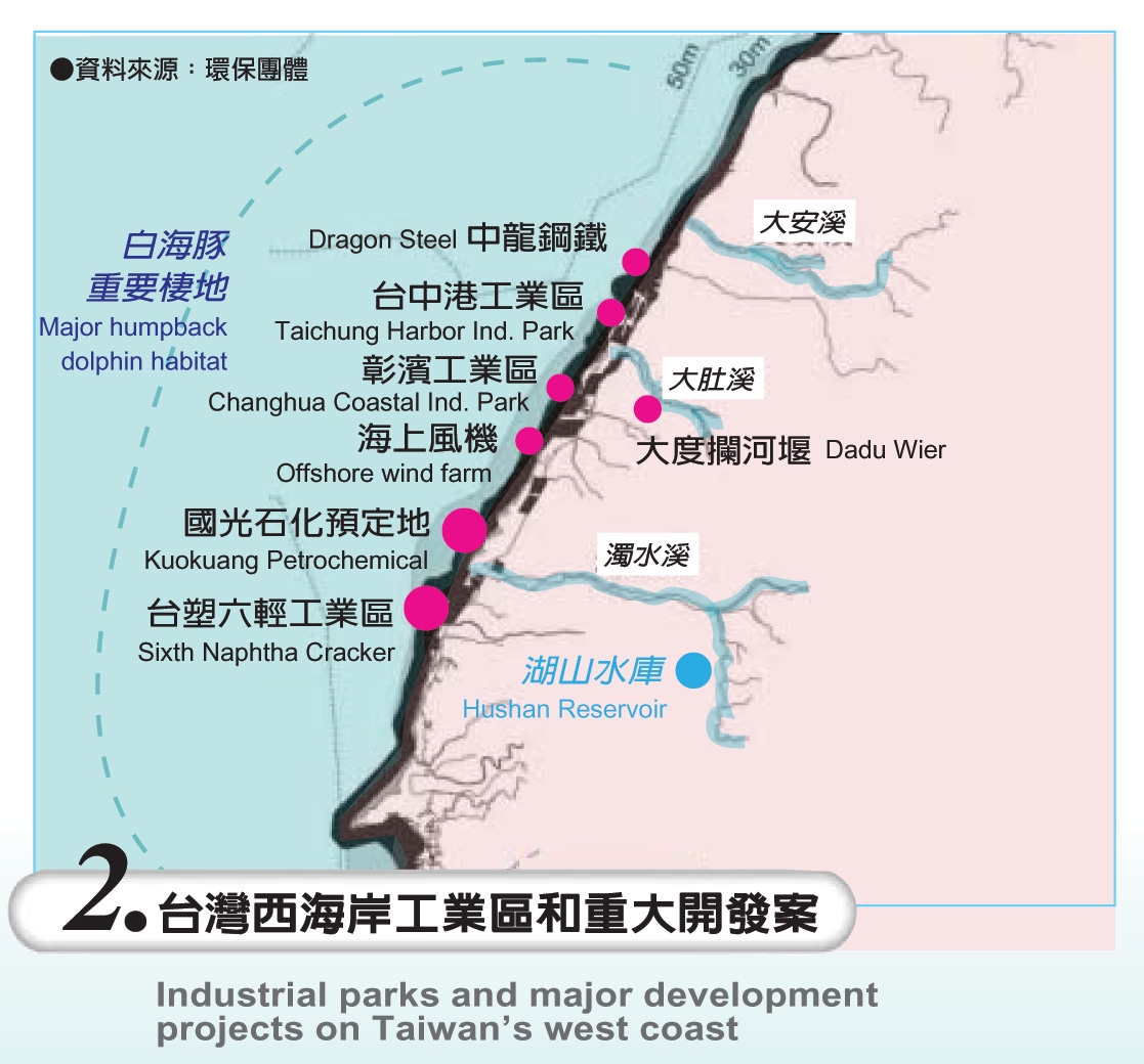 Throughout this same time period, the government was moving forward with plans for several major economic development projects all concentrated near important habitats of the humpback dolphins, including a thermal power plant in Changhua, Kuokuang Petrochemical's eighth naphtha cracker (with financial backing from China Petroleum Corporation), Phases 3 and 4 of the Central Taiwan Science Park, and the Dadu Weir Project (Fig. 2). Environmental groups frequently have attended environmental impact assessment meetings at the EPA to argue their case and stage protests. Their activities have caught the government's attention, and the Council of Agriculture has budgeted funds for expanded research by a team led by Chou Lien-siang. She won additional funding from the Taiwan Power Company (Taipower) and Kuokuang Petrochemical for further surveying that finally yielded a relatively thorough understanding of the humpback dolphins' ecology.