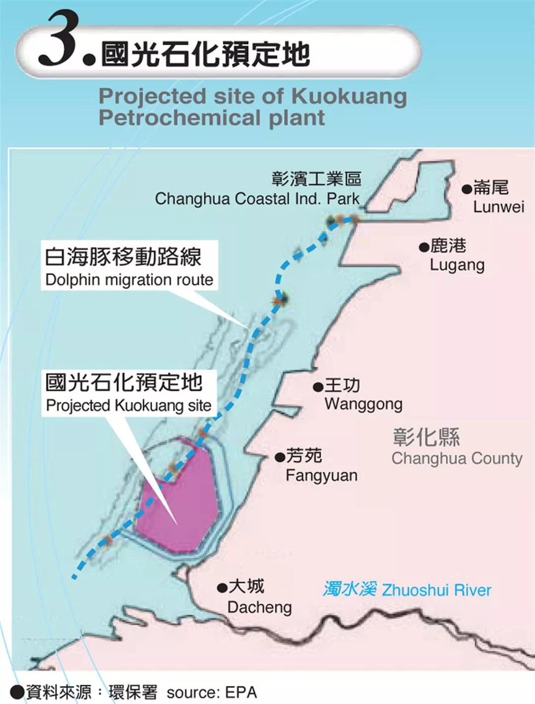 Even leaving aside the question of whether the humpback dolphins live and feed in the area selected for the Kuokuang Petrochemical complex, another question remains: the path followed by dolphins in their north-south movements cuts right through the western edge of the proposed site of the Kuokuang complex (Fig. 3). If the huge industrial complex sitting in the path of the humpback dolphins' north-south passageway cuts the population in two, will it hasten their extinction?
