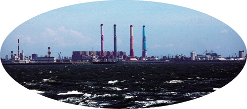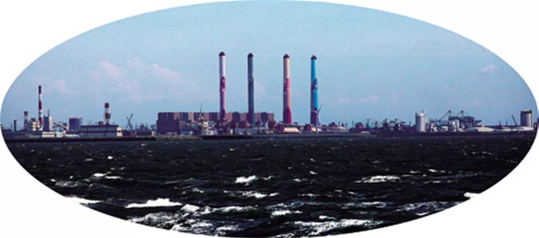 Taiwan's humpback dolphins live three kilometers offshore in an area along the west coast that bristles with factory smokestacks. Shown here along the coast are four massive smokestacks at the Taichung thermal power plant. Located right nearby are Dragon Steel Corporation, the industrial parks of Taichung Harbor, and a petrochemicals industrial park.