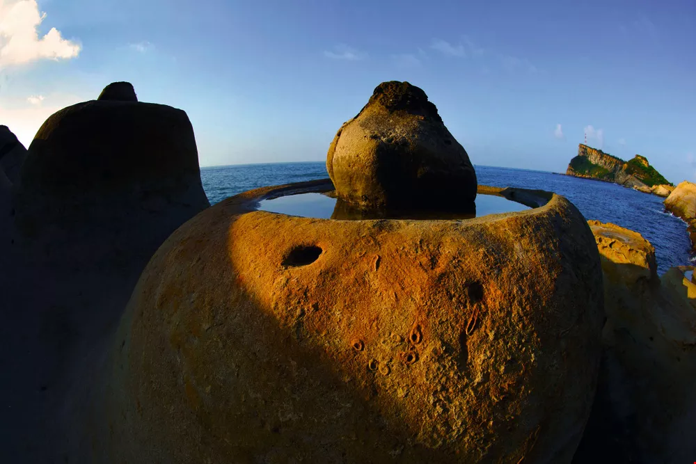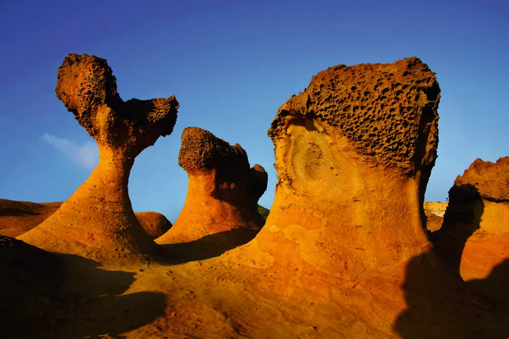 One will note during a stroll on Yeliu Cape how the sea waves have eaten away at the rock in patterns determined by the jointing of the rock, leaving smoothly surfaced orthogonal shapes. These are known in Chinese as tofu rock because the sharply cloven rock faces call to mind freshly cut blocks of tofu. Taiwan’s cold, damp northeasterly monsoon winds also work on rock of uneven hardness to carve out all sorts of weirdly shaped mushroom rocks. In the meantime, the hollow spots left behind by mollusks and crabs are also embellished through the erosive action of seawater, temperature, and wind to form honeycomb rock.