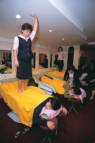 Cheap and relaxing Taiwanese massages have received a warm welcome from Japanese guests. Nearest in this photo is author Yuka Aoki.