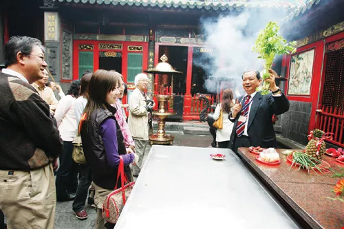 After taking in the museum's precious collection, many Japanese tour groups head to the Grand Hotel, where the Shinto Taiwan Shrine stood during the Japanese colonial era. There they enjoy a gourmet Chinese meal and appreciate the view of Taipei below. They take a rest in the afternoon, then head to the Chiang Kai-shek Memorial Hall to see the majestic structure and the historical documents it contains. Afterward, it's back on the bus for a look at the Presidential Palace--the Taiwan Governor-General's Office during Taiwan's Japanese era. In the evening, they go to the Taoist Hsingtien Temple for a firsthand look at Taiwanese folk religion.