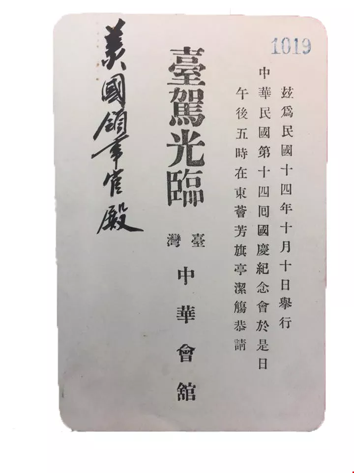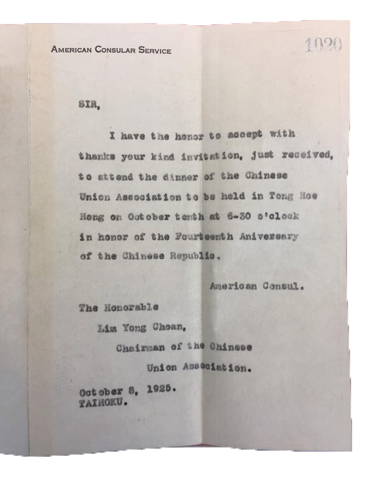 An invitation that the US consulate in Japanese-era Taipei received from the ROC consulate-general.