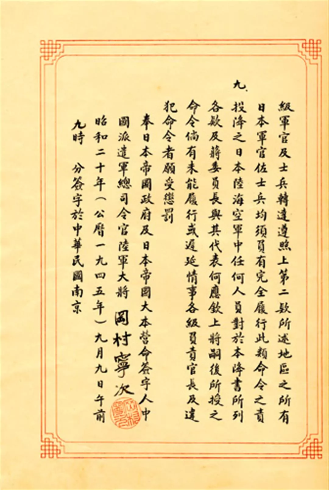 Nanjing, September 1945: ROC Army commander-in-chief Ho Ying-chin accepts Japan’s Instrument of Surrender, signed by Japanese expeditionary force commander Yasuji Okamura.