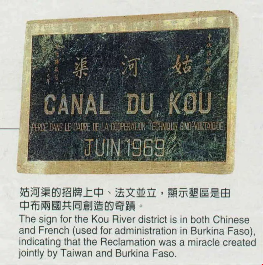 The sign for the Kou River district is in both Chinese and French (used for administration in Burkina Faso), indicating that the Reclamation was a miracle created jointly by Taiwan and Burkina Faso.