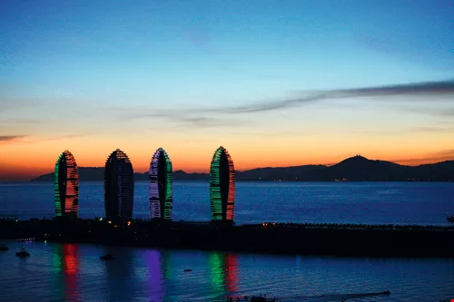 Taiwanese investors began developing Hainan some 20 years ago. Having since experienced a real-estate bubble and land seizures, some are leaving, others staying, and still others are preparing to leap aboard the “international tourism” bandwagon. The photo shows the manmade Phoenix Island, located just off the coast from Sanya, with its landmark skyscrapers.