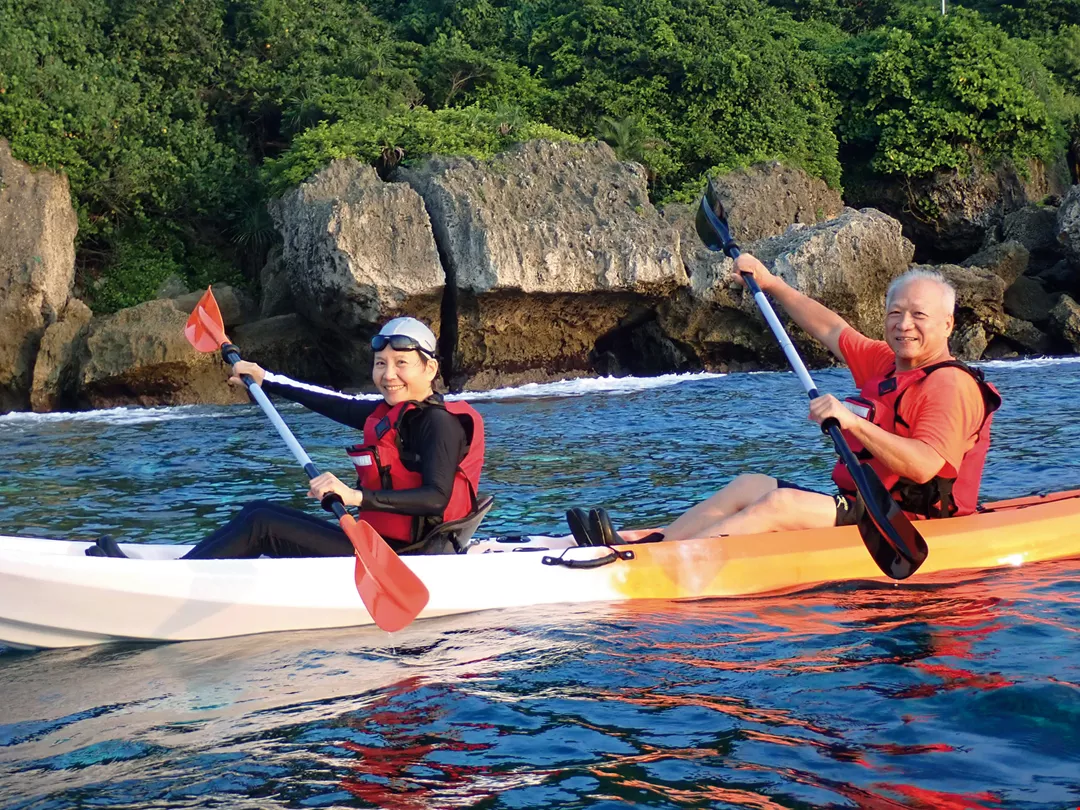 “Young-at-heart sailors” Jean Chen (left) and Lin Huaisheng (right) feared the sea in the past but now enjoy it. They have paddled a canoe together past the Qingshui Cliff in Hualien and navigated to Yonaguni Island in Okinawa, Japan. (courtesy of Ocean Life Dream Workshop)