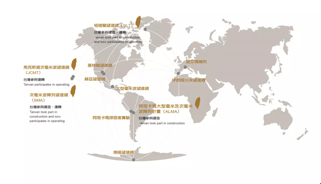 The locations of the elements of the Event Horizon Telescope. Those marked with a Taiwan icon are telescopes constructed and operated with Taiwanese participation.