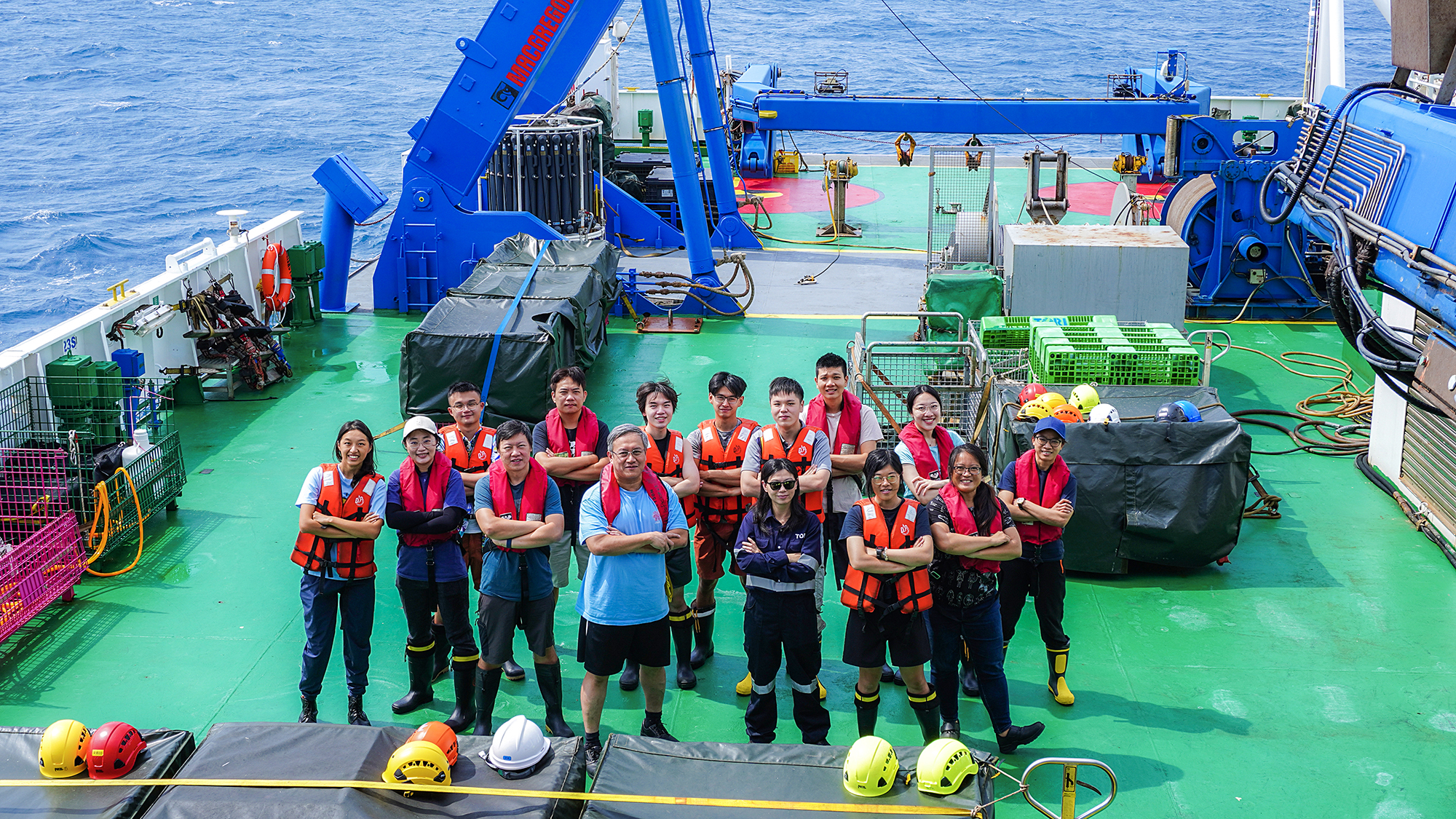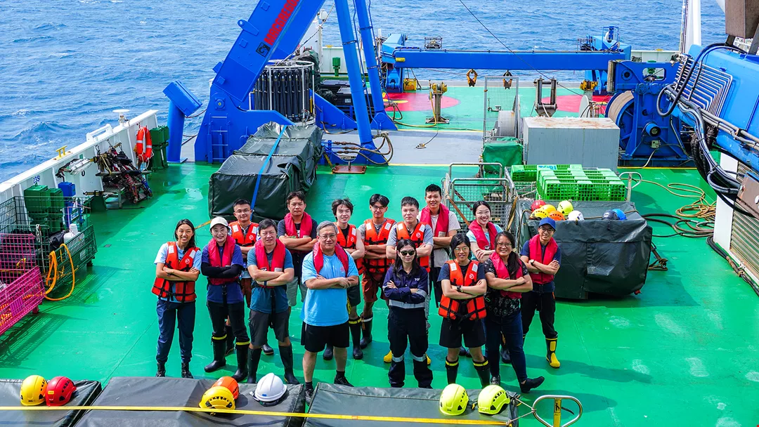 Ho Tung-yuan (in light blue shirt) and his team setting out to sea on the Taiwanese marine research vessel Legend. (courtesy of Ho Tung-yuan)