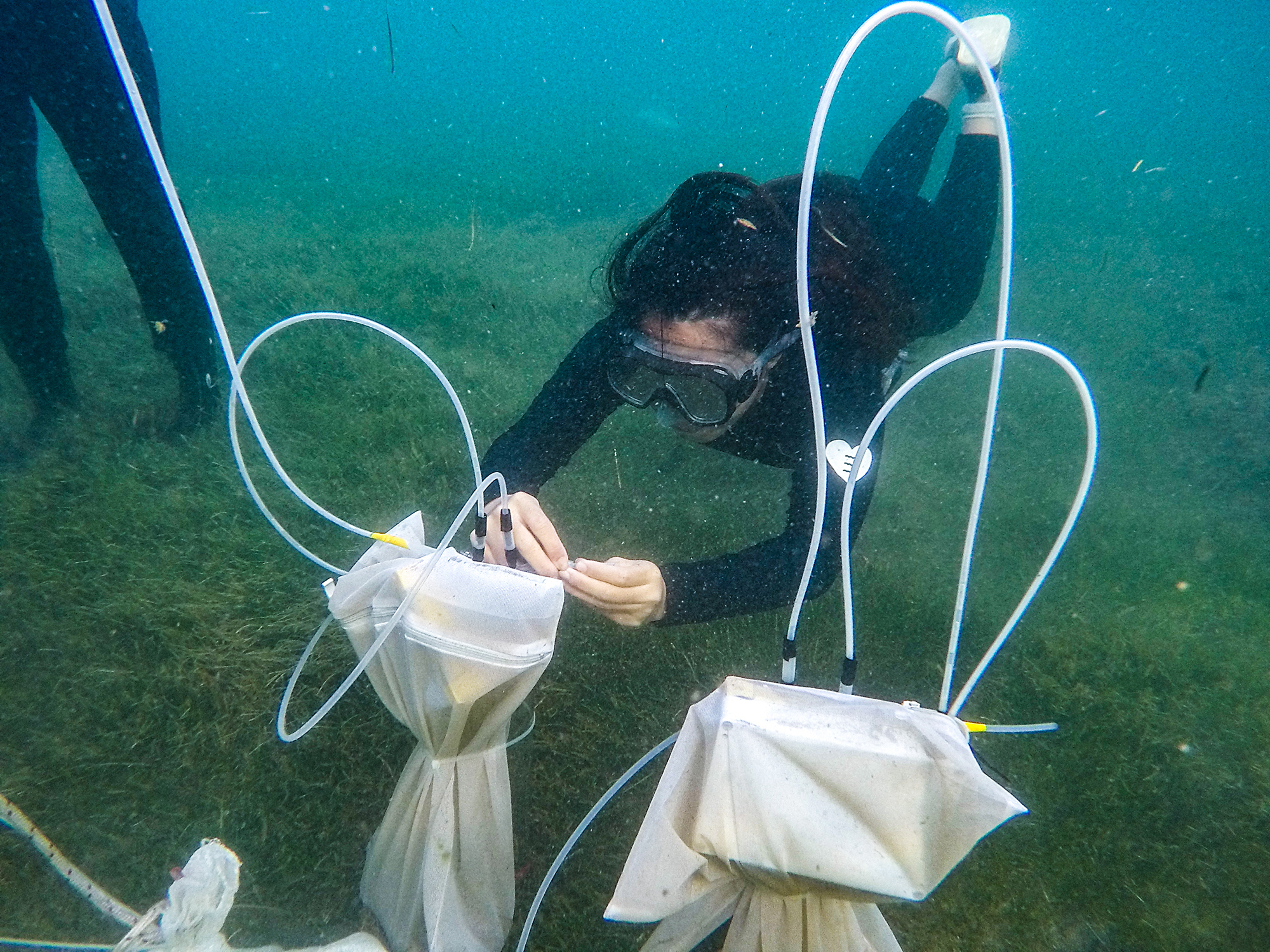 Researchers collect samples from the seafloor in order to measure the amount of greenhouse gases released by sediment on seagrass beds. (courtesy of Tseng Hsiao-chun, Institute of Marine Environment and Ecology, NTOU)