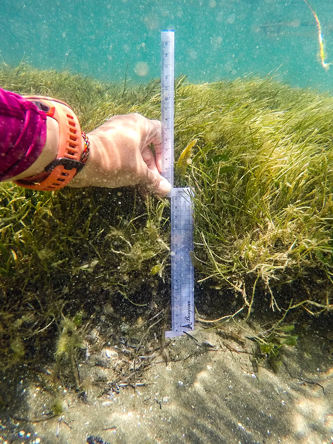 It is possible to determine the amount of organic carbon stored in seagrass beds by measuring the height of the plants. (courtesy of Tseng Hsiao-chun, Institute of Marine Environment and Ecology, NTOU)
