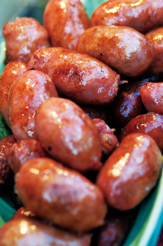 Over six decades old, Miaokou Night Market offers old-time cuisine,such as richly seasoned dingbiansuo (below) and value-for-money bite-sized sausages (facing page, bottom). The stall owners wear uniforms, and the signs are clearly marked in Chinese, Japanese and English.