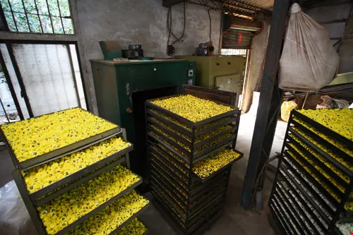 Freshly picked chrysanthemums are dried for 16–20 hours at temperatures ranging from 20–100 ºC. Once processed, they are most often used in Traditional Chinese Medicine or as an infusion. The photo shows “golden chrysanthemums” that are about to be dried.