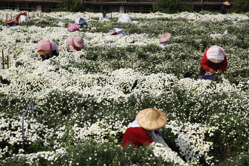 The hangju industry is very labor-intensive, but these days fewer and fewer people want to be farmers. It’s a dilemma for those promoting the industry. The photo shows harvesting of Tongluo white mums.