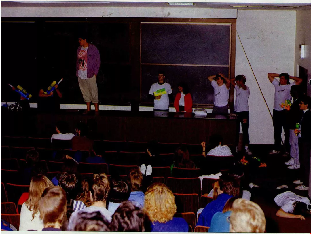 (Left) Despite their nerdy image, the brilliant students of Caltech have a mischievous side, and the underclassmen often play weird pranks on the last day of term. The professor in the red sweater has been captured by Klingons.