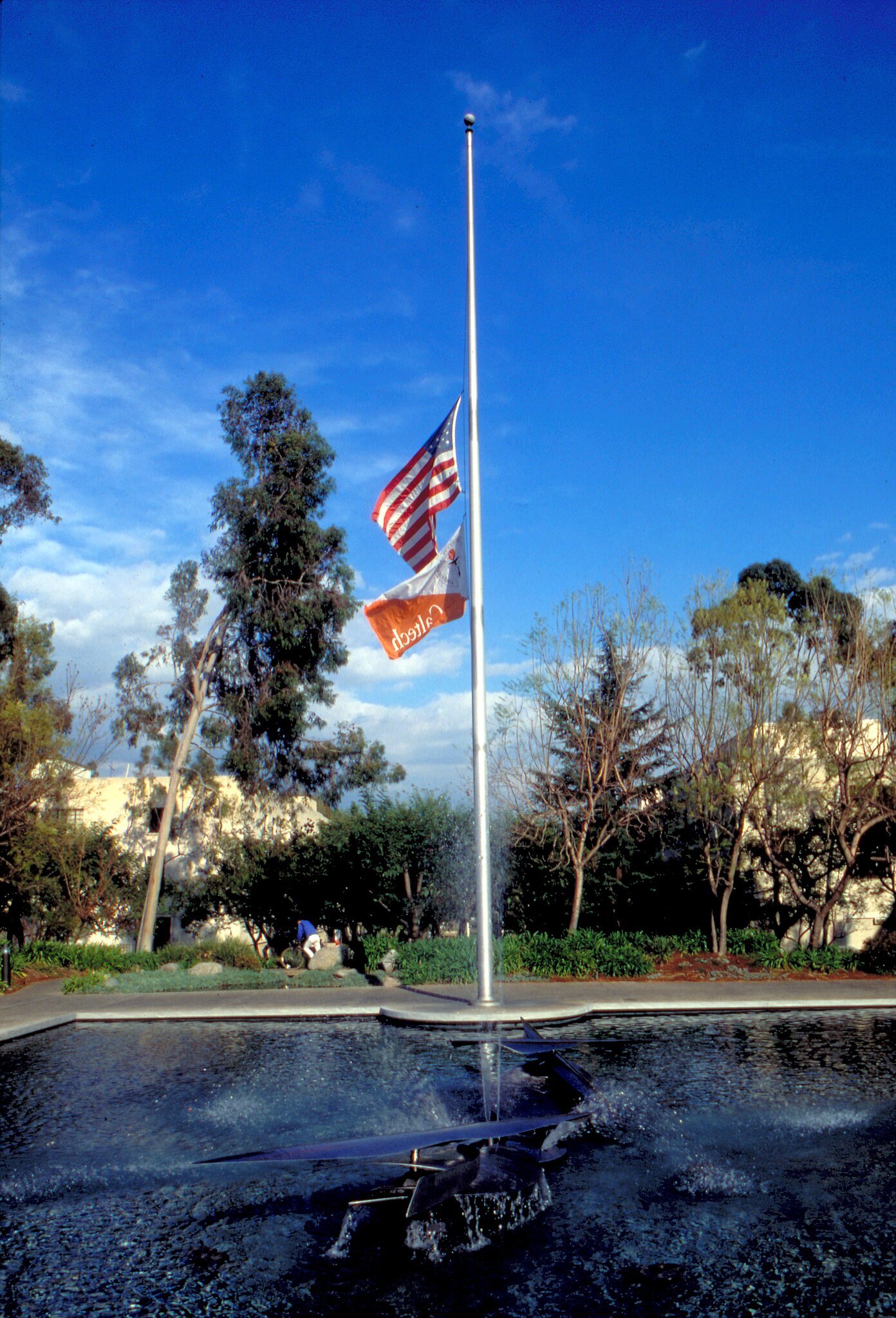 Caltech faculty and students are a closely knit family. When a professor dies, the flag is flown at hall staff. The fountain is a student creation: the metal fi sh are rotated by the water they spout.