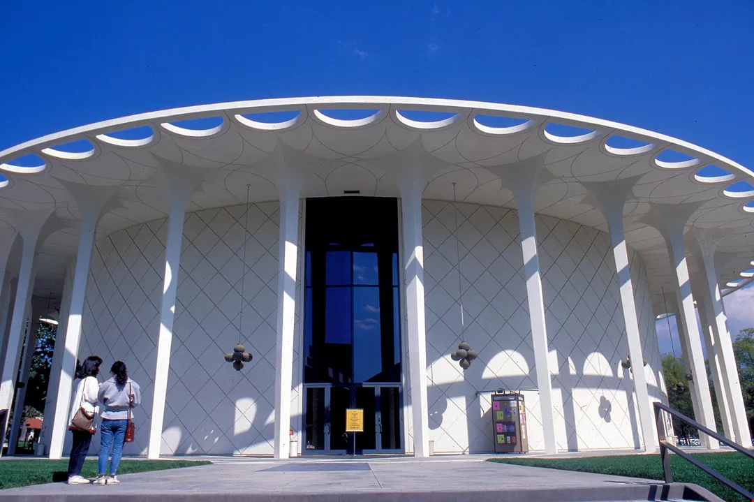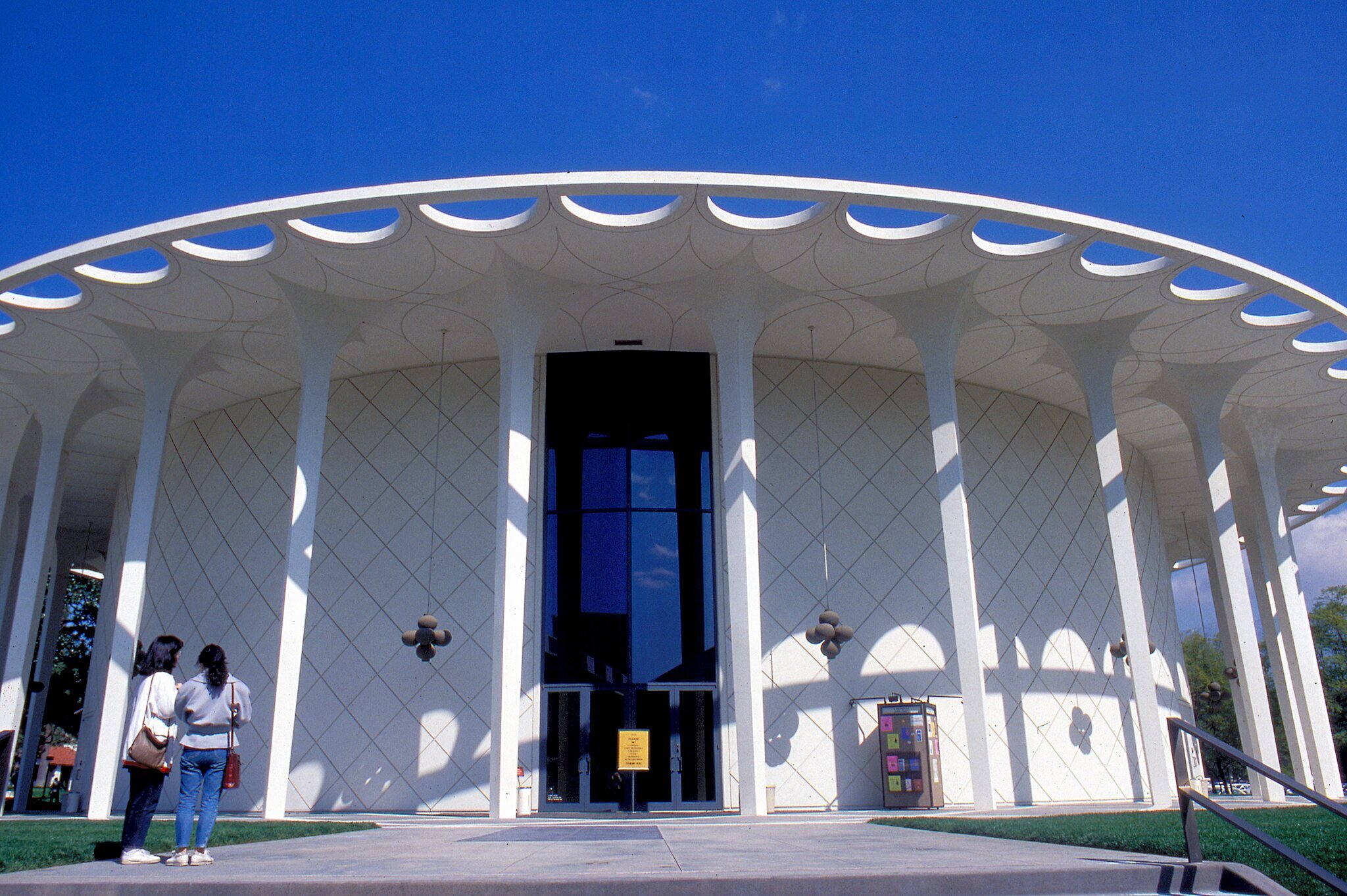 (Left) Beckman auditorium has a distinctive geometrical beauty.