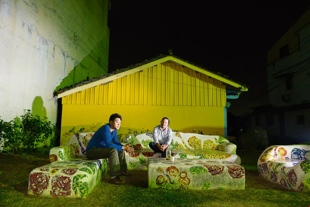 Chen Yuliang (right) and Huang Dingyao carry on with their student-era dream, setting down roots in Tugou. Pictured here is their hibiscus-themed work Warm Parlor. They transformed a plot of discarded land into a small living room, fine both in form and function.