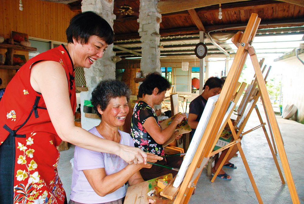 Moved by the human story of the Tugou residents, Kaohsiung painter Chen Shuhui (first left) came here to teach painting to the residents, paying for her own move. Her classroom is a converted pig shed.