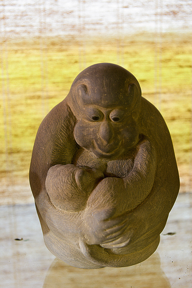 The workshop and home built by stone carver Hou Jiuafu (right) and his wife is constructed mostly of recycled material. During the creative process, Hou puts the stone shards left over from his carving work directly onto the dirt floor. The right photo shows his piece Mother and Child.
