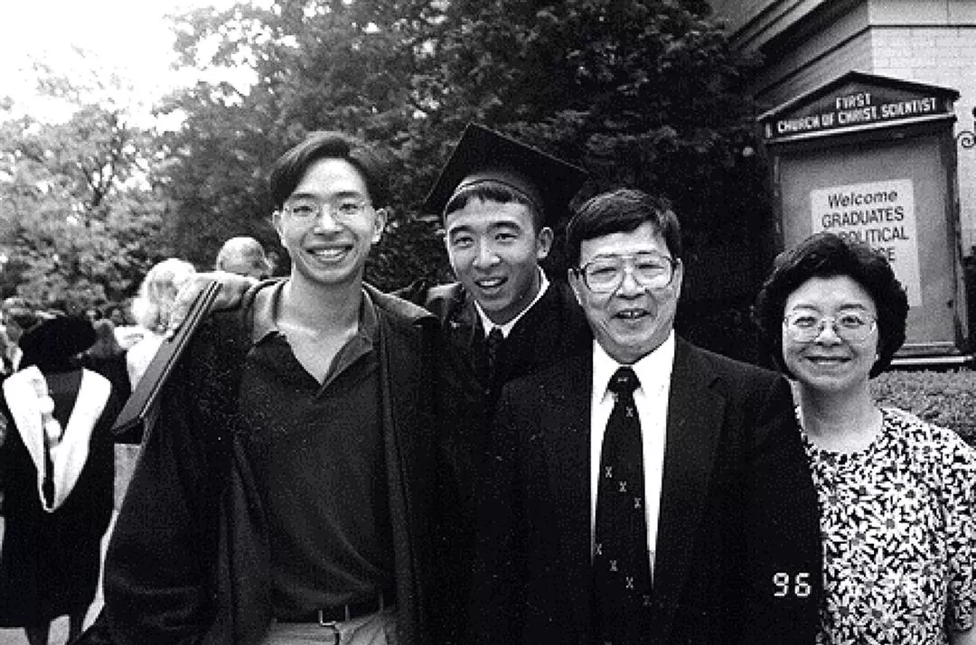 Andrew Yang’s parents, Kei Hsiung and Nancy, and his older brother, Lawrence, attend his graduation ceremony. (courtesy of Yuan-Liou Publishing Company)
