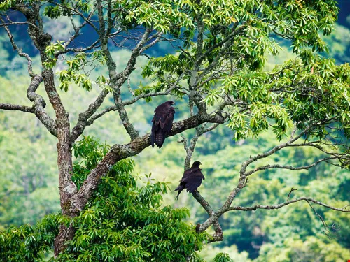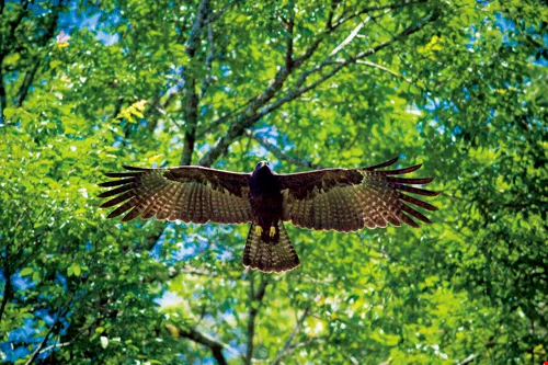 The black eagle, with its large wingspan, is a master of flight, often cruising majestically above the forests.
