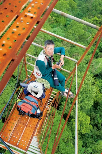 In the afternoon, he drives to a road within the boundaries of the botanical garden to wait for black eagle, but sees nothing. The next day he treks high up the mountain to his private eagle-viewing point, a 25-meter-tall steel-frame tower, which he painstakingly climbs.
