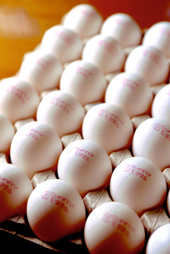 Sunny Eggs’ newest egg washing and sorting machine, made in Denmark, can process 36,000 eggs an hour. The washing and sorting process is an in-house operation that includes visual inspection, cleaning and disinfection, drying, ultraviolet disinfection, candling inspection to eliminate bloody and broken eggs, acoustic crack detection, grading, packaging, refrigerated transport and storage.