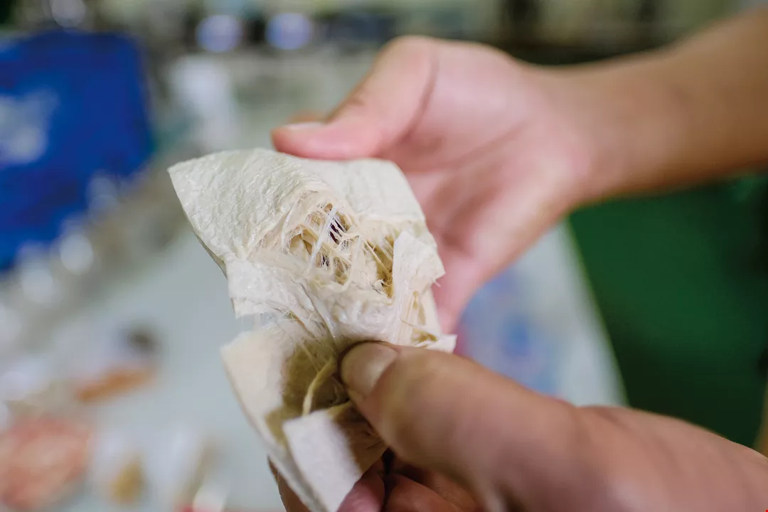 Hung Yang’s vegetarian “meat” has fibers resembling those of real meat.