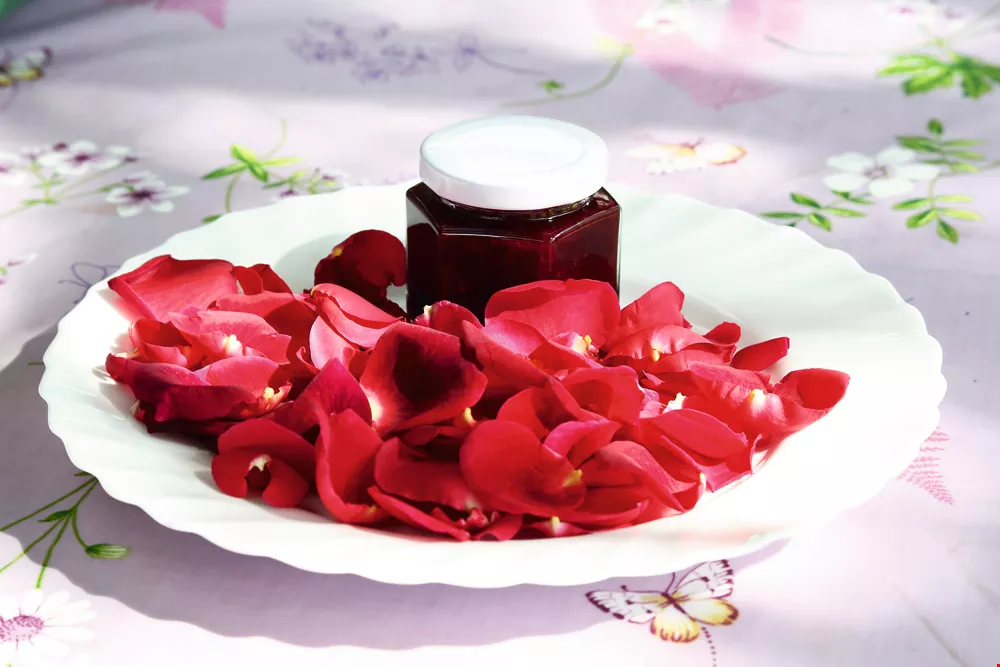 Ten blossoms go into each jar of rose-petal jam. Sugar and lemon juice help preserve the color and scent of the beautiful, toxin-free flowers.