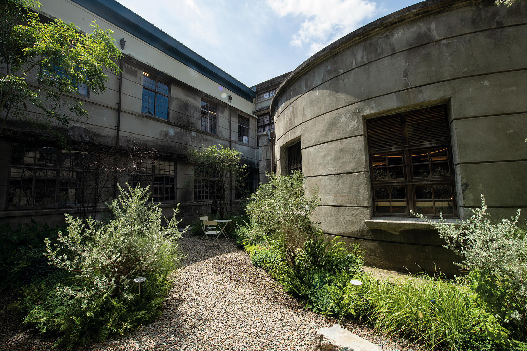 The garden outside Not Just Library at the Songshan Cultural and Creative Park was once a derelict place. Its former wildness inspired Wu to aim for a primeval style and introduce nearly a hundred different plants into the garden’s narrow space, complete with various Taiwanese ferns. The dominant color is silvery grey. This is a quiet nook where the mind, saturated after a visit to the library, may relax and contemplate.
