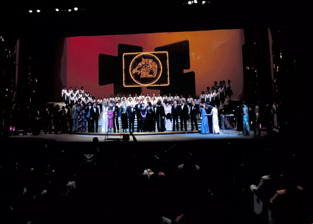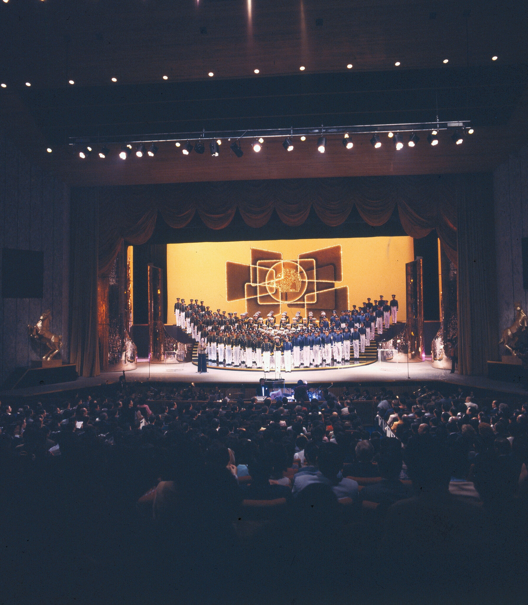 3.4. Director-general of the Government Information Office, Dr. James. C. Y. Soong and Kao-hsiung Mayor Yang Jin-tsung address the awards ceremony. 1. The Golden horse awards have become the most coveted and respected prizes in the motion picture industry. 2. Students from the Armed Forces Military Academy sing in chorus during the awards ceremony.