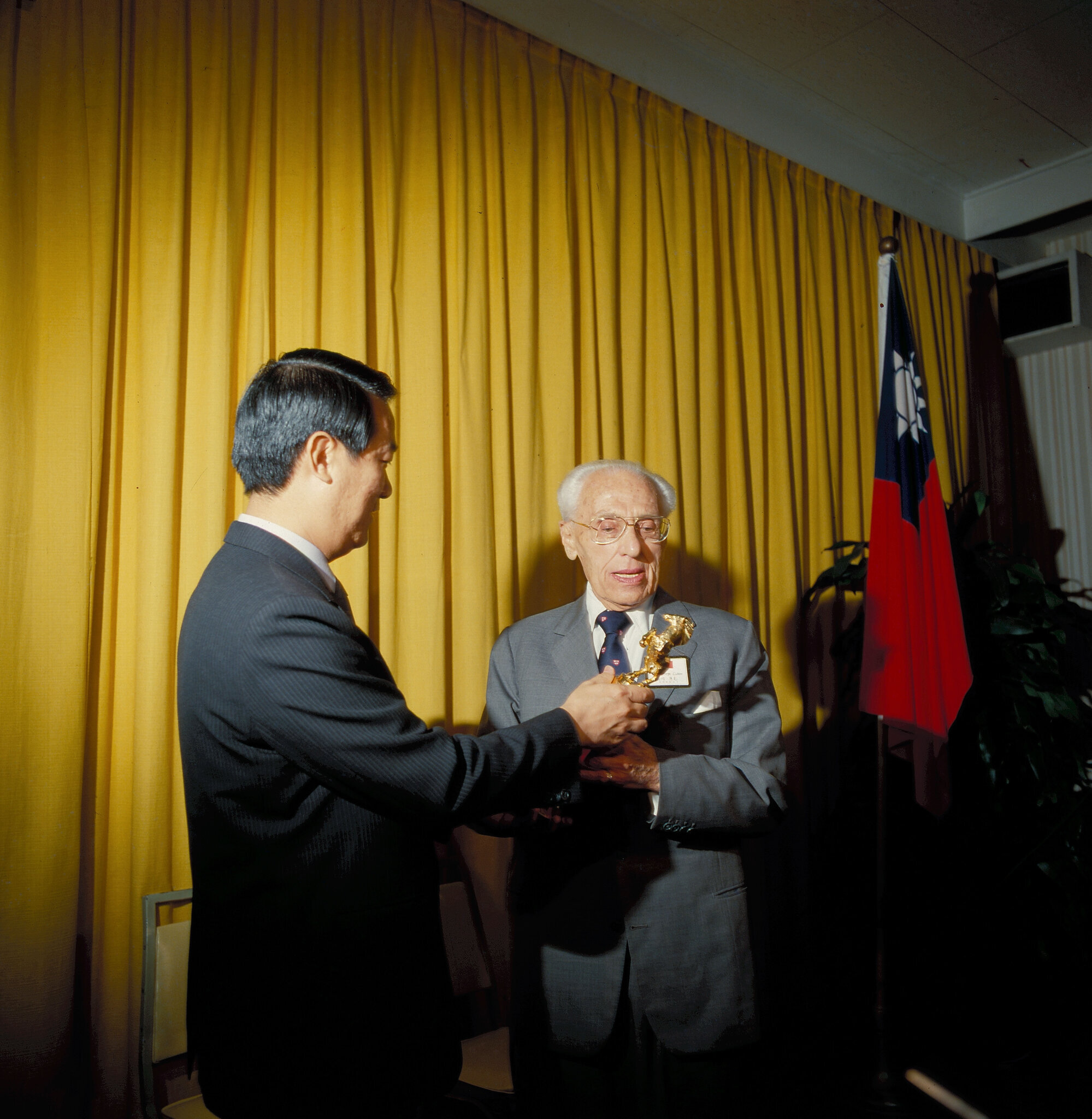 Hollywood director George Cukor receives a presentation from Dr. James C. Y. Soong for his outstanding contributions to the movie industry.