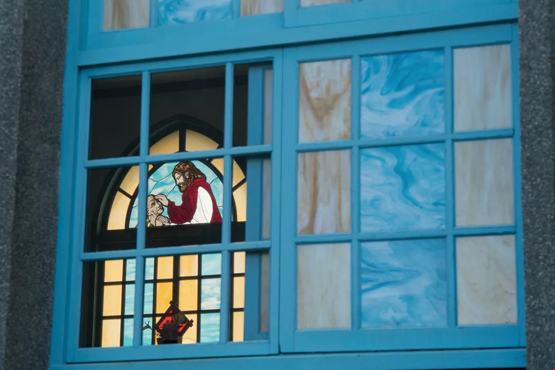 The beauties of the stained-glass windows are to be appreciated under different light from different angles.