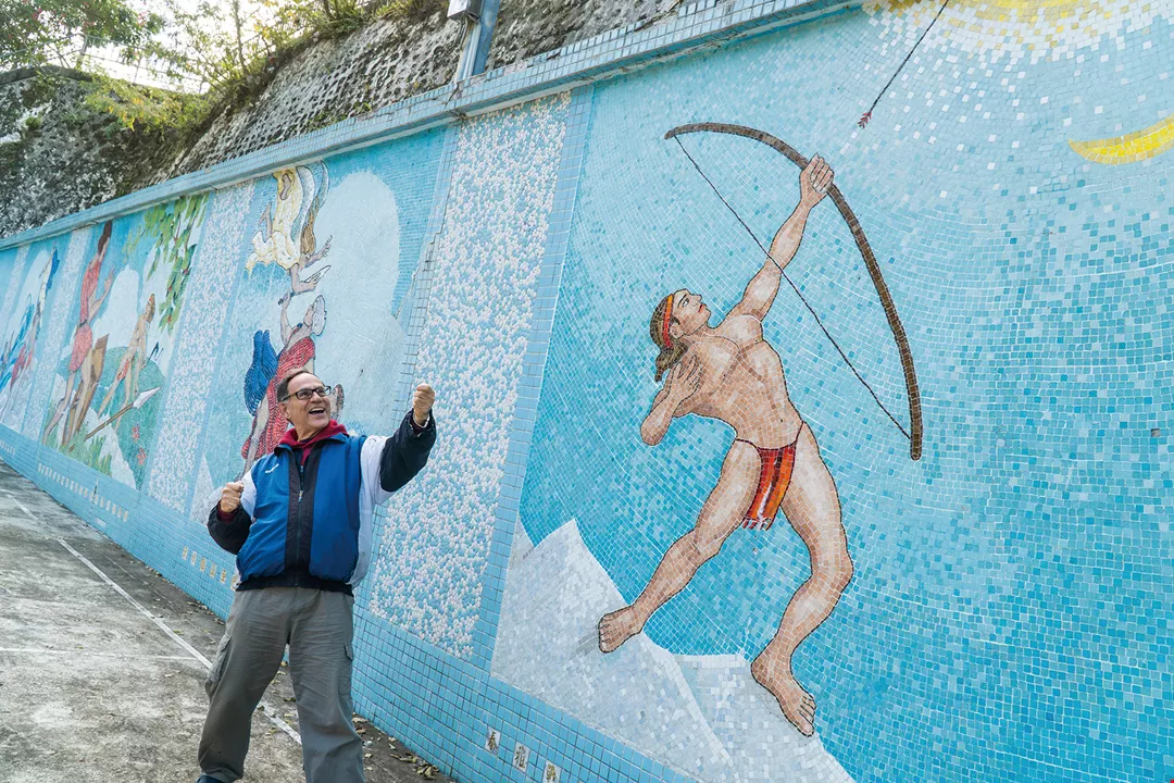 In front of the mosaic he spent 15 years making, Martinson playfully imitates the stance of the Atayal archer, demonstrating a spirit of perseverance.