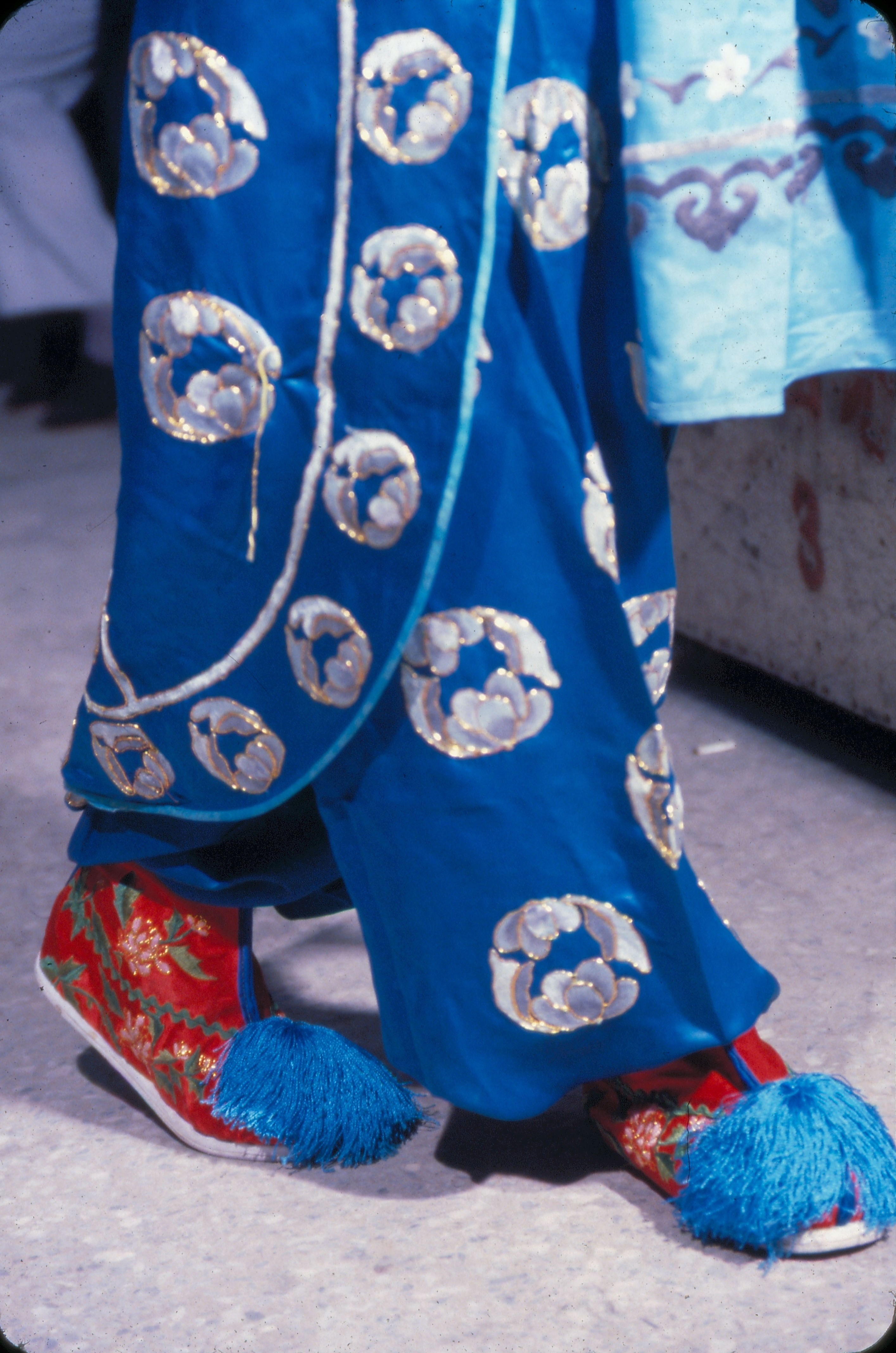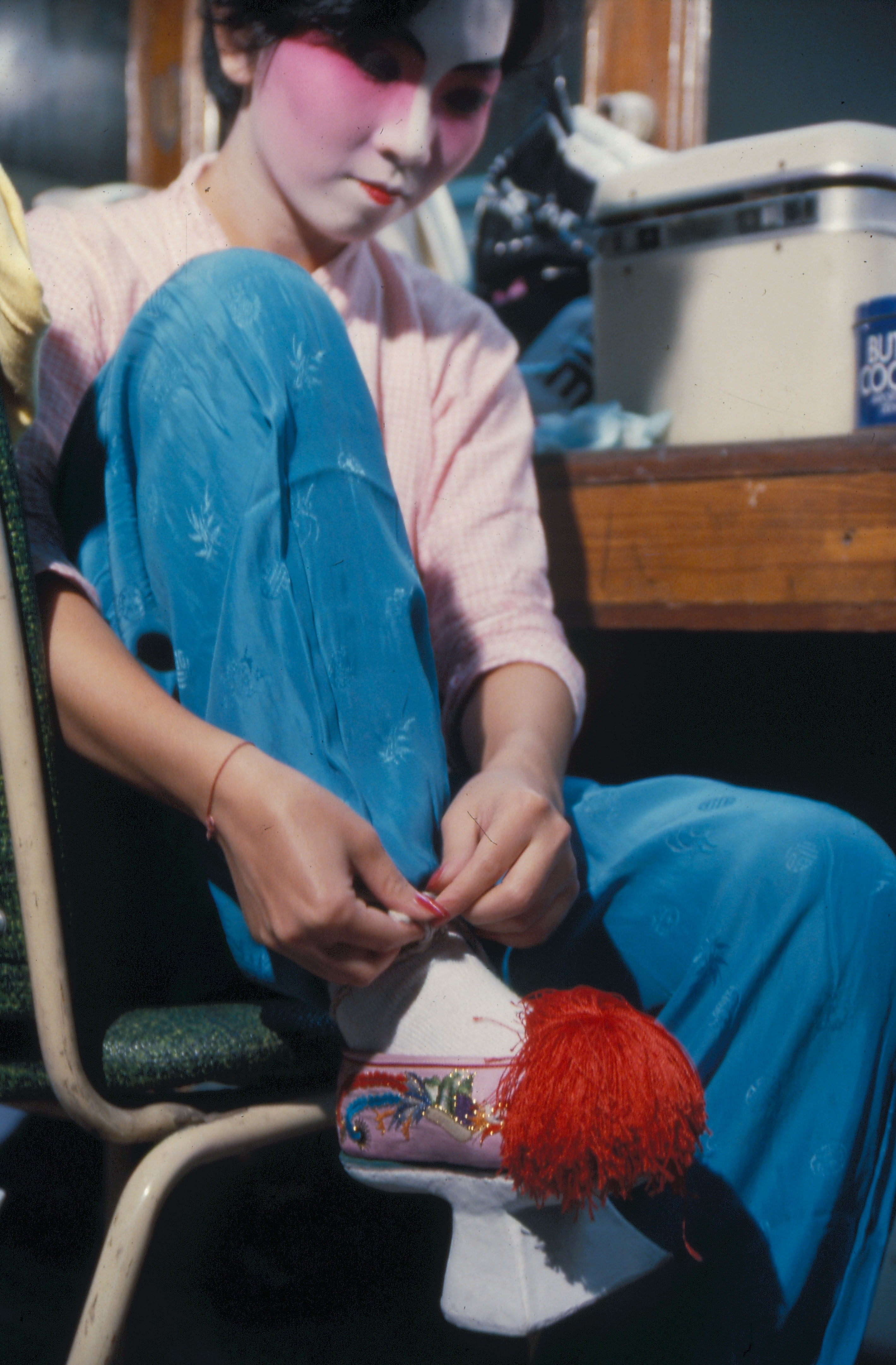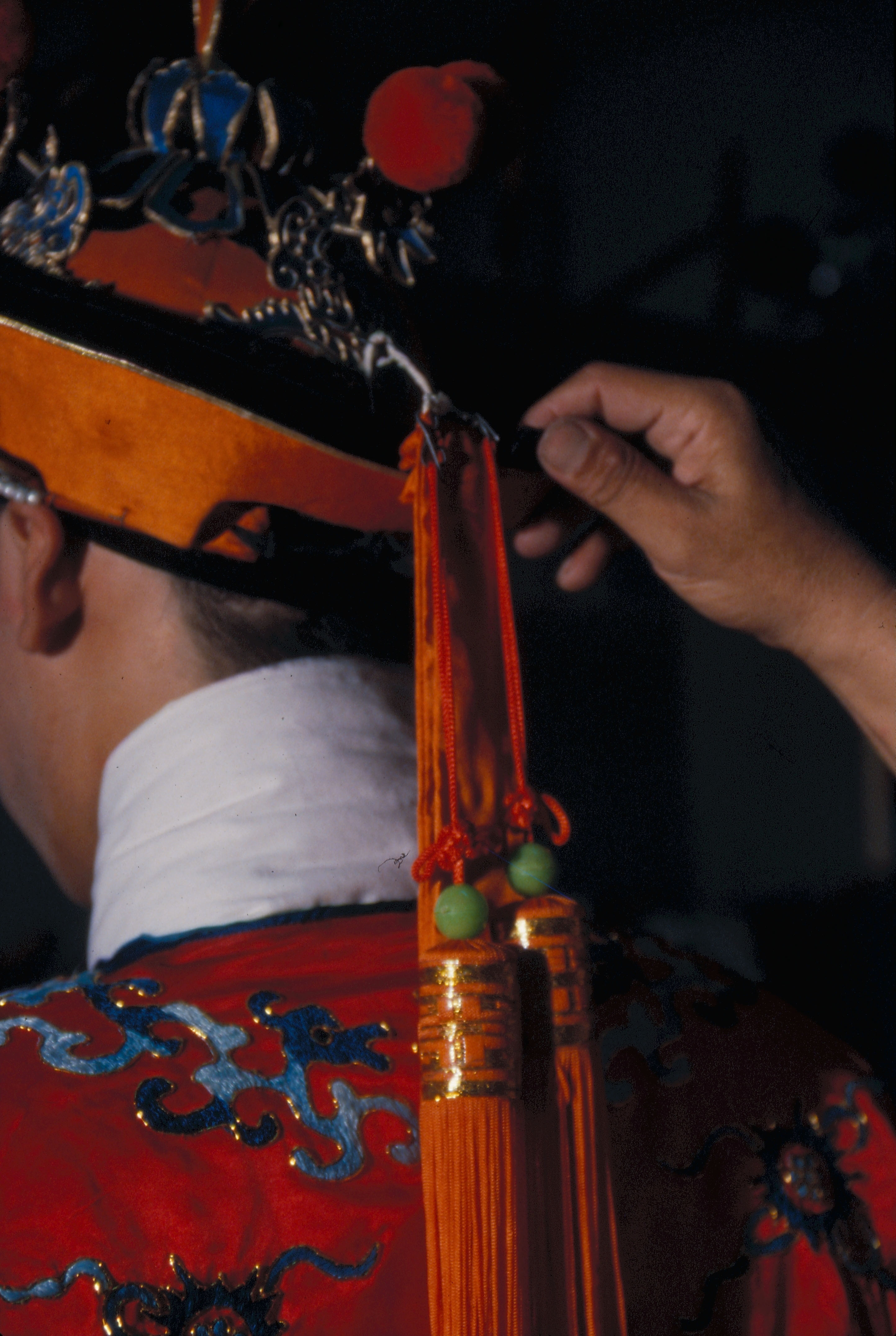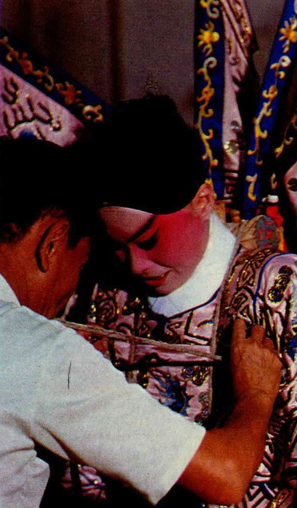 1. The blue scarf and black robes tell the audience that this girl is from a poor family. 2. Master Chao creates an elaborate costume. 3. Backstage costume manager securing the pennants. 4. Emblems such as this distinguished between high and low ranking officials in imperial times, but today in Peking opera they are used more for effect than for signifying rank. 5/6. Li Yu-hsiou is an expert at making Peking opera shoes. 7. Putting on boots backstage. 8/9. Flat soled embroidered shoes and thick soled boots.