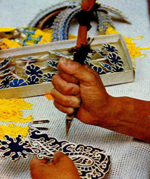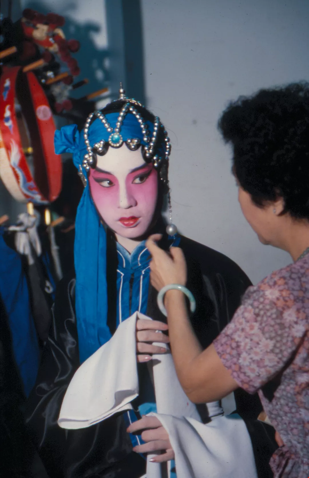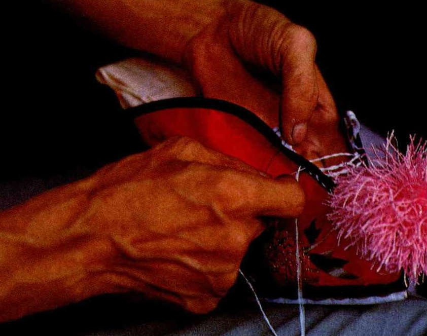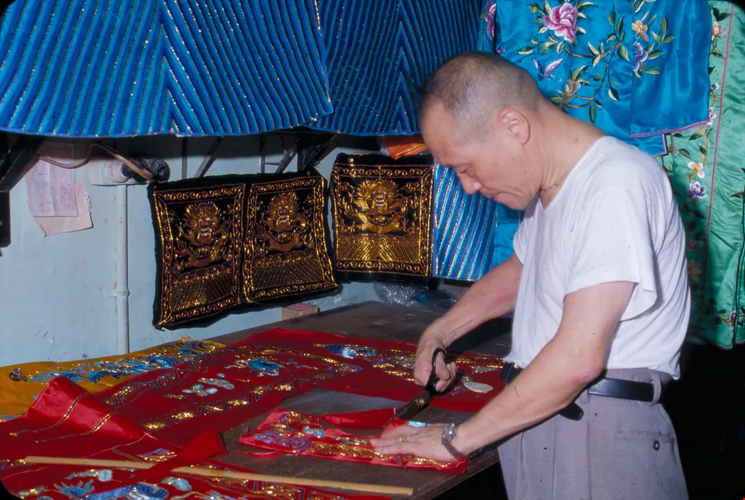 1. The blue scarf and black robes tell the audience that this girl is from a poor family. 2. Master Chao creates an elaborate costume. 3. Backstage costume manager securing the pennants. 4. Emblems such as this distinguished between high and low ranking officials in imperial times, but today in Peking opera they are used more for effect than for signifying rank. 5/6. Li Yu-hsiou is an expert at making Peking opera shoes. 7. Putting on boots backstage. 8/9. Flat soled embroidered shoes and thick soled boots.