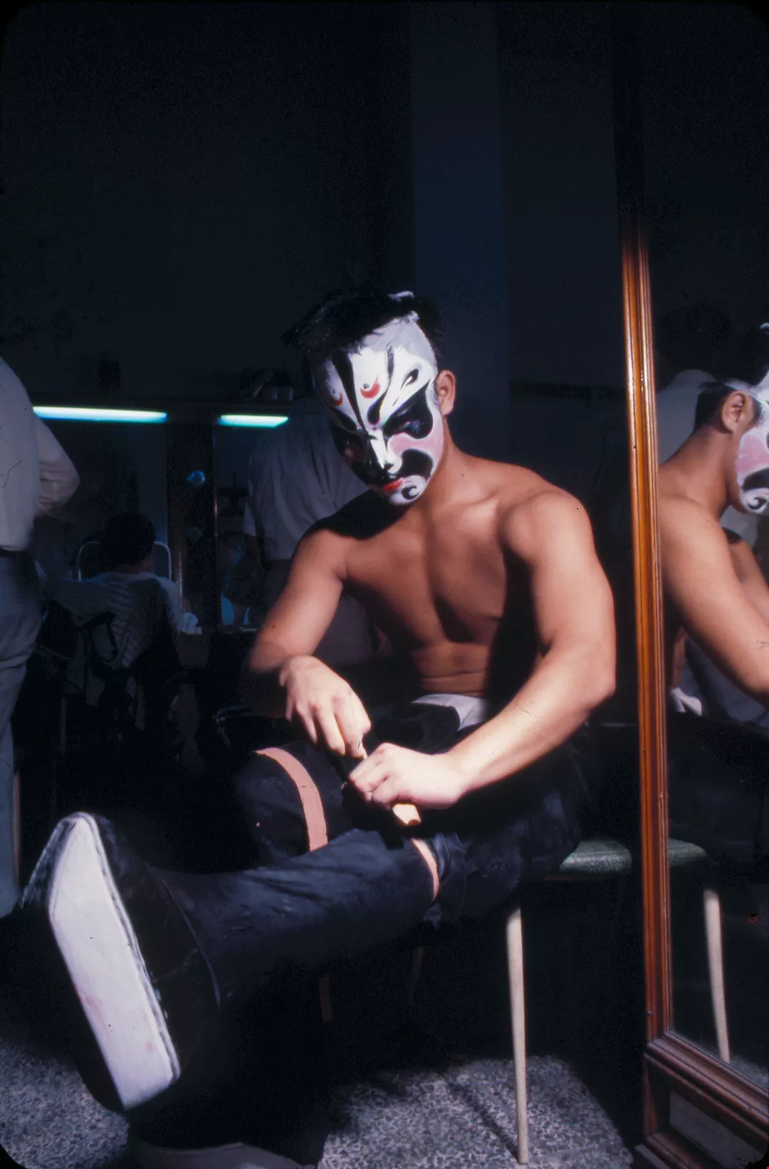 Putting on boots backstage.