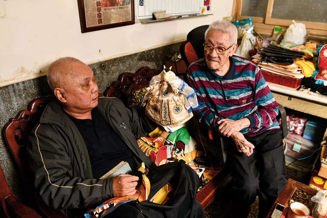 Xu Zhengzong (left), director of the Hsin Hsi Yuan Puppet Theater, often drops by Chen Hsi-huang’s home for visits. The two often chat about the old days, including the bygone heyday of glove puppetry.