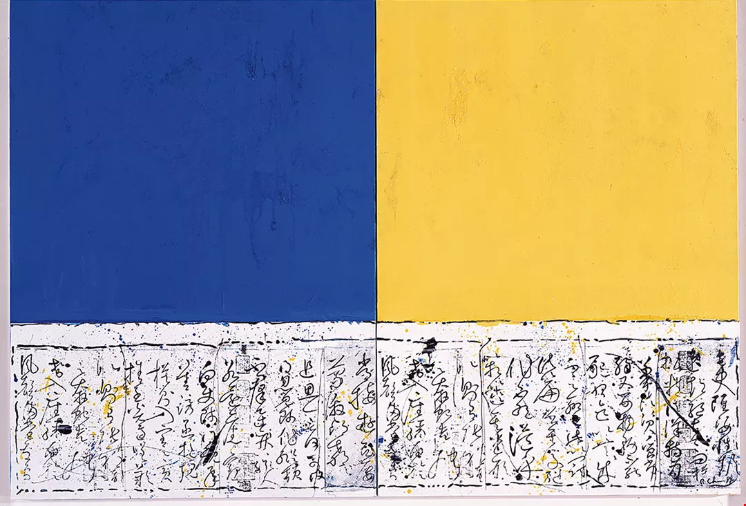 Having observed that human life had entered a virtual space constructed from the most basic numerical elements—zeros and ones—Chen was inspired to create his “Digital Space” series. He divided his canvases into three blocks, two at the top and one across the bottom. The top two blocks were colored in blue and yellow. The panel stretching across the bottom featured Chinese calligraphy in the wild cursive style. In introducing Chen’s work his biographer, the French-based Chinese author Zu Wei, once explained that the blue represented the ocean and the yellow the land. Together they represent the quantum world in which humans exist. The text and images adorning the lower portion, on the other hand, represent the digital living space. Chen thus captured our digital age with the simplest of abstract elements. The series once again elevated him to the pinnacle of his art form. He was 66 that year.