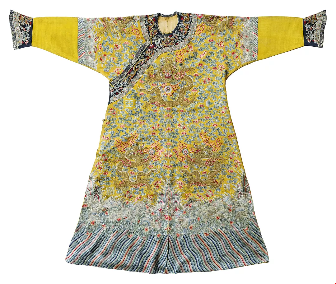 Chen Cheng-hsiung has found new sources of artistic inspiration in different cultures, including the gentle beauty of Qing-Dynasty court apparel and the use of brilliant colors in Aboriginal art. The photo shows a Ming-Dynasty dragon robe in yellow silk brocade, embroidered with the auspicious “12 Ornaments” that symbolize imperial authority and power.