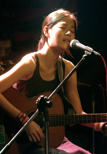 Her style is mainly "urban folk"--just vocals and acoustic guitar. Her lyrics, a combination of English and Chinese sung in a way that, in contrast to many of her peers, can be deciphered effortlessly, express her understanding of life and what she has learned along the way. Her most popular hit, "Baby," is sung in a genteel, lullaby-like tone: "My baby, baby / Let me give you something sweet / So you'll sleep well tonight." Written out like this, it looks a little sappy, but in fact it is a song she wrote to make herself feel better after leaving home after an argument with her parents.