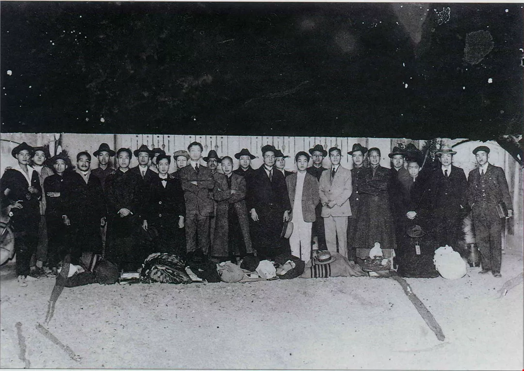 In 1923, Lai (front row, wearing the long jacket and with his arms crossed in front of his chest) was arrested following the "Pacification Police Incident." This photo of Lai and fellow prisoners (without hats) being met by friends (wearing hats) was taken in January of the following year. (photo courtesy of the Lai Ho Memorial Museum)