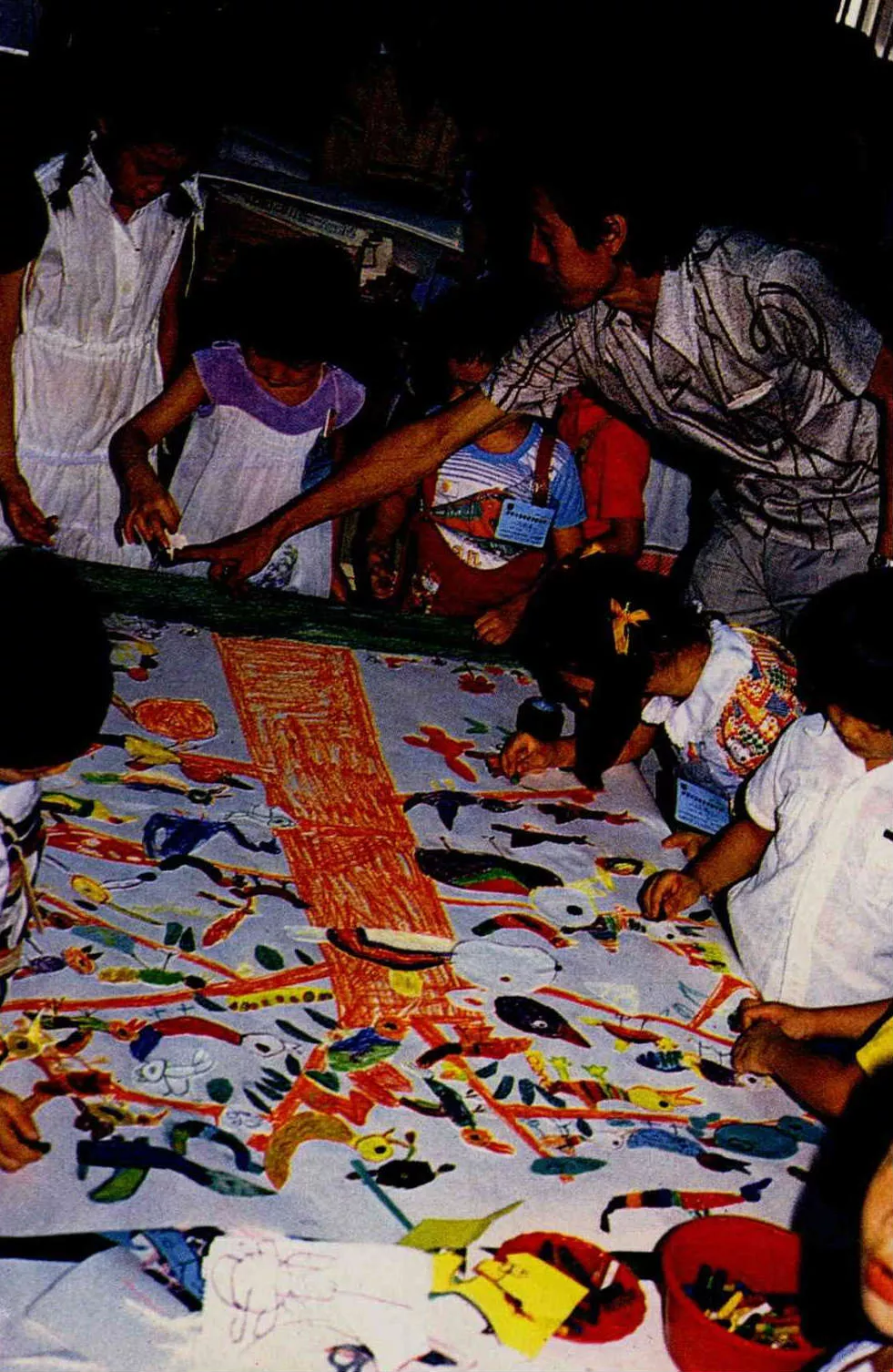 1. The long neck of the giraffe symbolizes its aspirations and hopes. Cheng Ming-ching painting (2) and instructing children (3). 4. The three-dimensional effect of "Small Whale Going out to Sea."