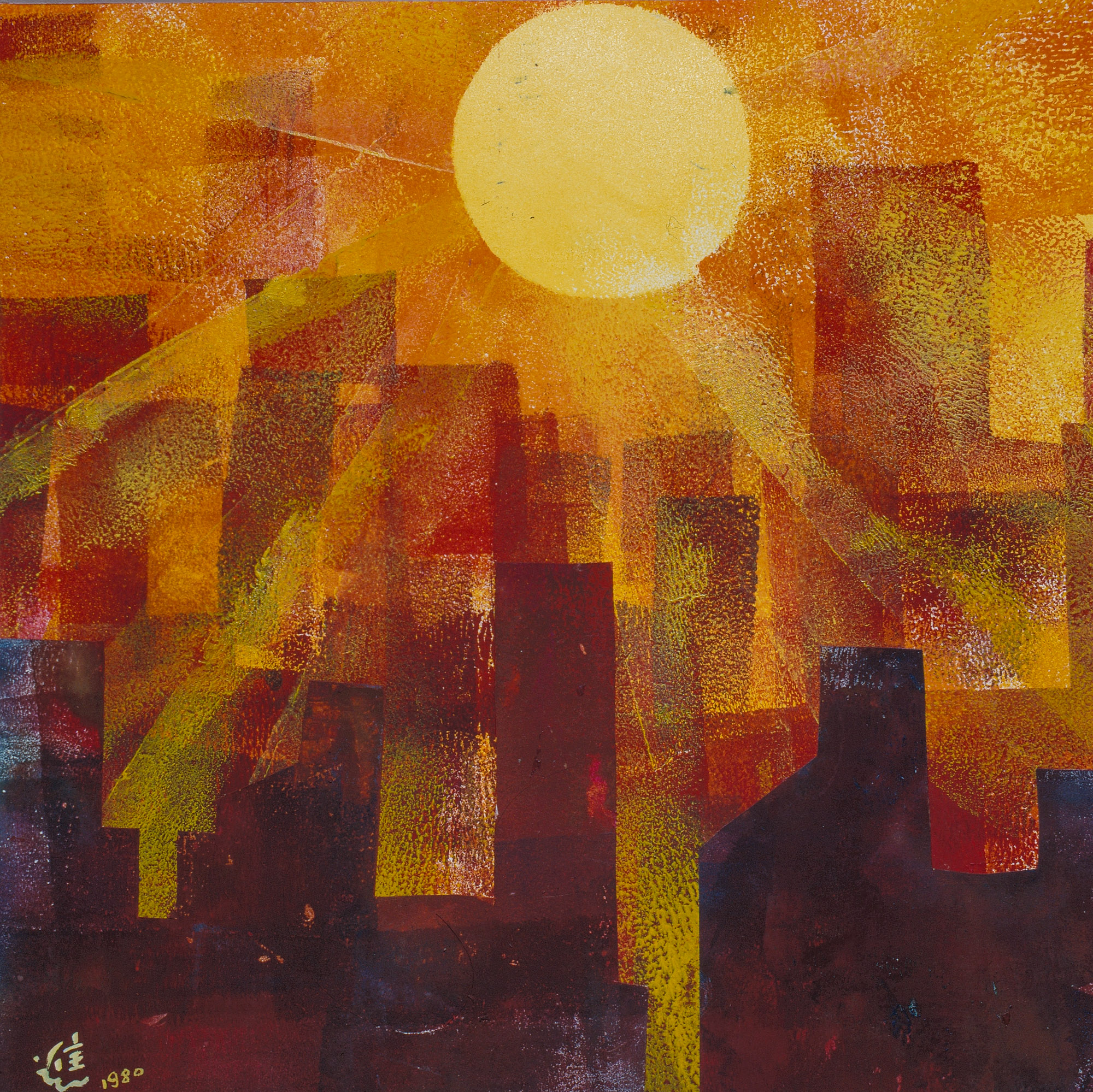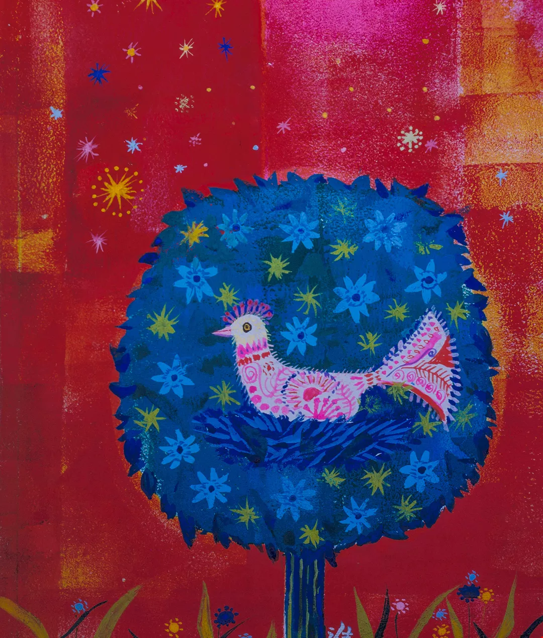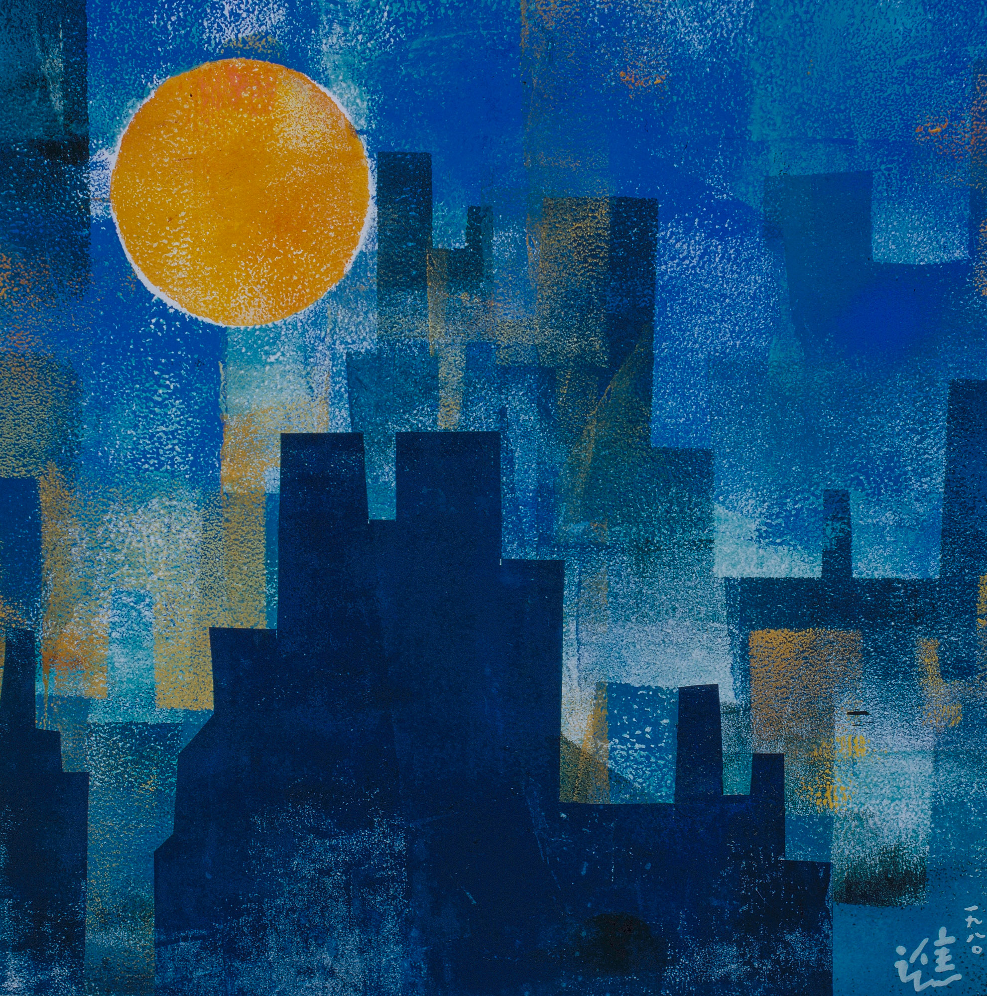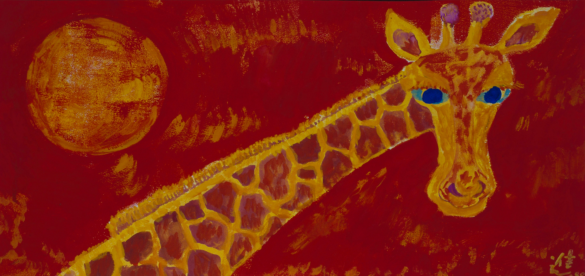 Each of his paintings has its own unique features. For instance, in the painting titled "Giraffe," Cheng used a red background and orange sun to represent the searing heat of Africa. The emphasis on the long neck of the giraffe symbolized its aspirations and hopes. "Bird," a painting based on a children's poem depicts a brightly colored bird nesting in a blossom-laden tree, with stars in a red sky and grassy meadows as background.