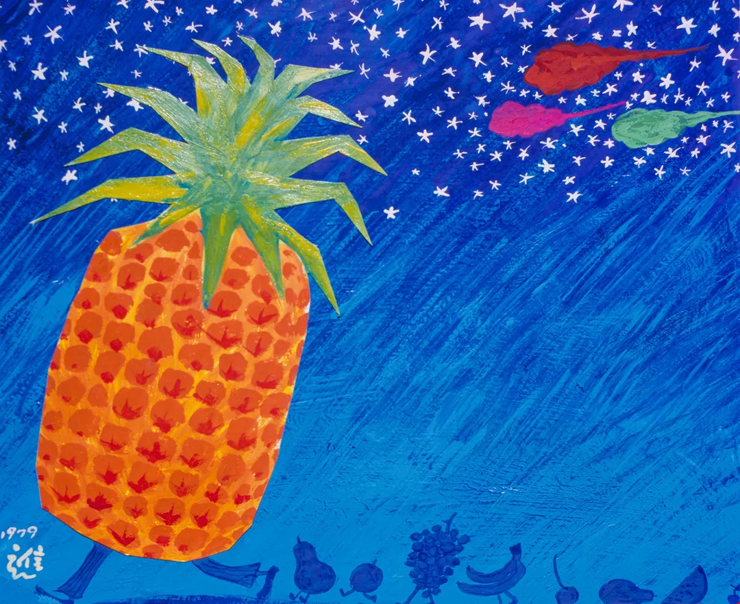 Cheng represents pear, pineapple, banana, grapes and oranges as if they are running to attend a "party for fruits.