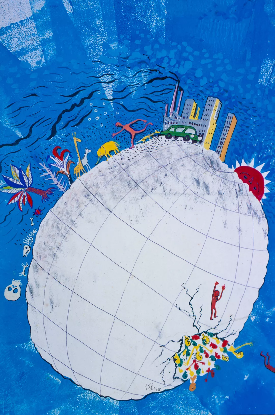 In "polluted Earth," Cheng uses bold lines to represent the population explosion and the problem of air pollution.