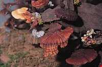 Current research shows that mushrooms produce at least 100 different natural antibiotics, and that many edible mushrooms have the effect of lowering blood pressure, contain special bioactive polysaccharides that can improve the human immune response and inhibit tumor growth, thus helping to prevent and combat cancer, or have constituents that can reduce blood cholesterol levels. On display in the "mushrooms' back garden" at the museum in Wufeng are real specimens of lingzhi (reishi) mushrooms (Ganoderma spp.), caterpillar fungus (Cordyceps sinensis) and fu ling (Poria cocos), all of which have long been prized as products to improve and maintain health.