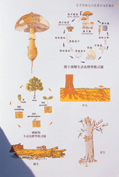 On entering the museum, the first thing to meet the eye is the "mushroom model zone," in which enlarged models of mushrooms are on display. The biggest is a shiitake mushroom 250 centimeters tall, which provides a favorite backdrop for visitors to have their photos taken. To the right is a huge painting, "Taiwan's Four Seasons and Hundred Mushrooms," by Wufeng artist Tseng Po-lu. Based on the Song-dynasty poem "Mushrooms" by Yang Wanli, the painting vividly depicts Taiwan's wild and cultivated mushrooms against the background of the island's four seasons, thus leading visitors into the mysterious world of fungi.